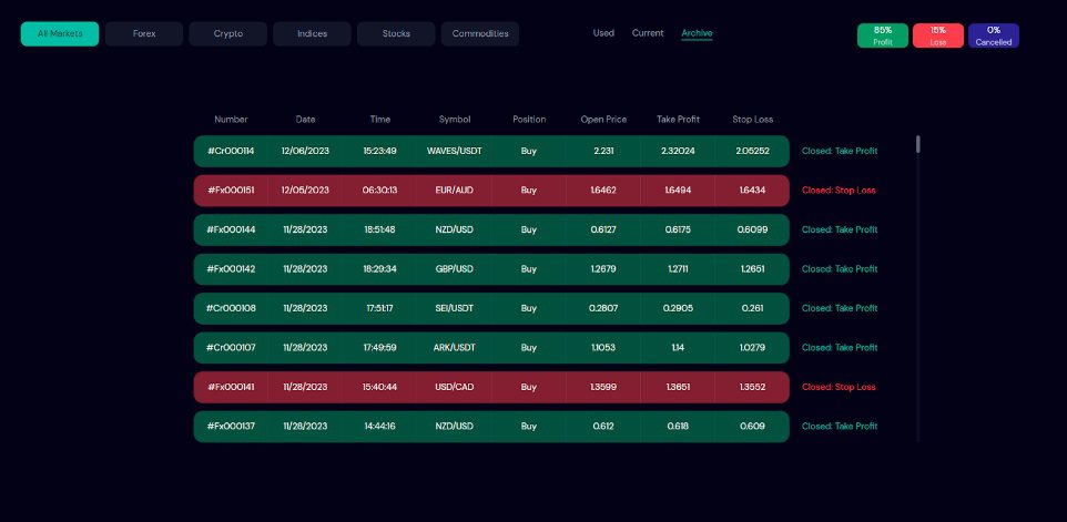 A “Use Signal” functionality allows traders to mark signals used to execute trades for their records. Over 100 new tradable signals are published monthly. Signals are proven accurate via backtesting, boasting over 75% positive results in general.