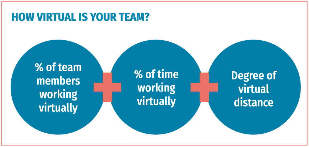 The degree of virtuality in any project team can be roughly estimated by adding the percentage of the team members who work virtually, the percentage of time the team is working in a purely virtual set-up, and the degree of so-called virtual distance.