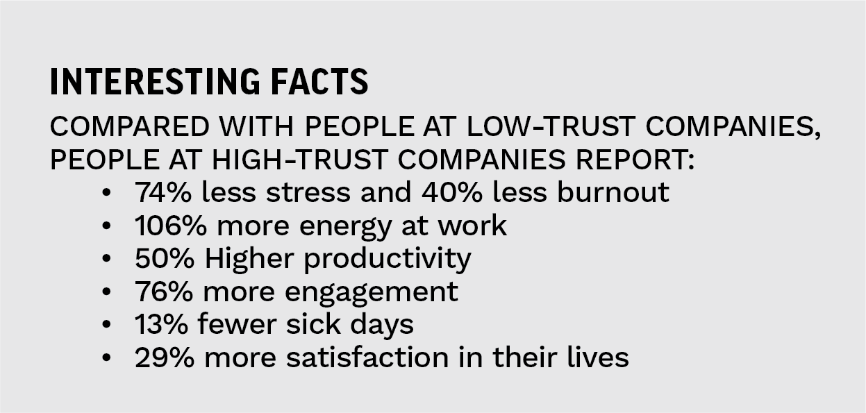 - Facilitate whole-person growth: High-trust workplaces help people develop personally as well as professionally. Numerous studies show that acquiring new work skills isn’t enough; if you’re not growing as a human being, your performance will suffer. High-trust companies adopt a growth mindset when developing talent.