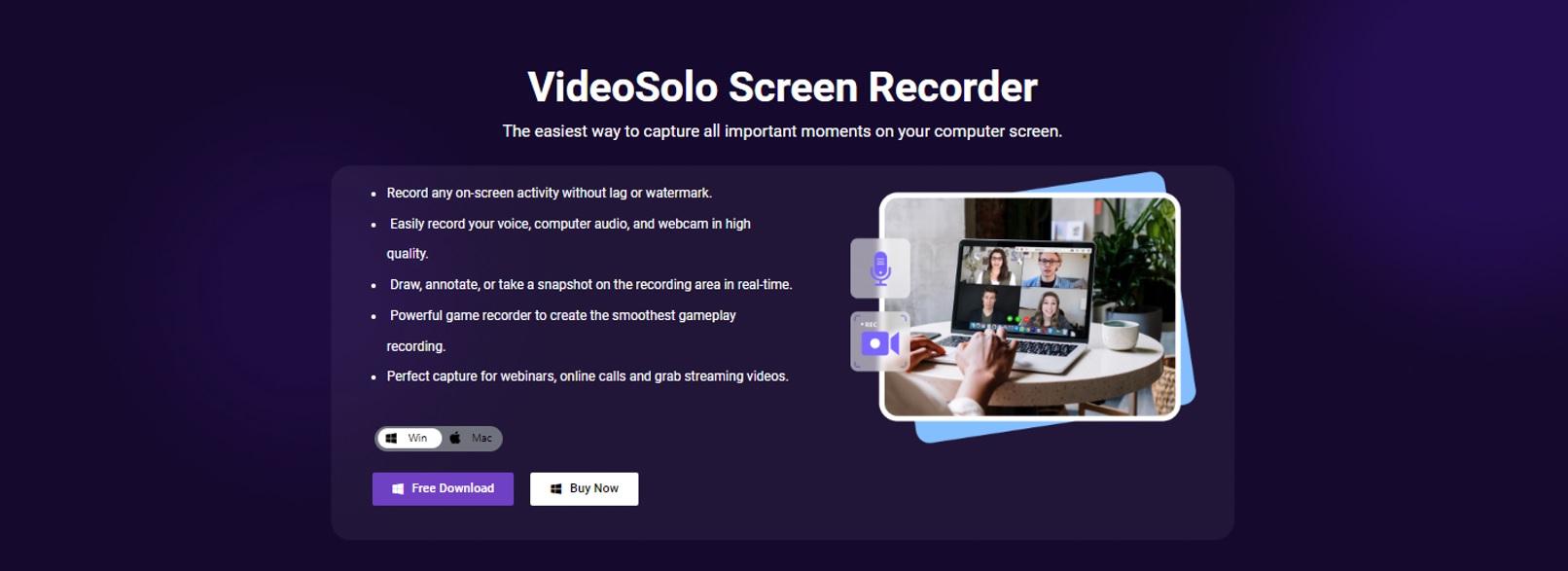 Do you want to capture important moments on your computer screen? You will need VideoSolo screen recorder to record every on-screen activity without a watermark. It allows you to record high quality computer audio, webcam, and voice.