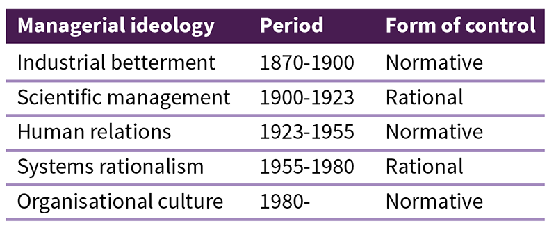 In these waves, managerial discourse alternates between ideologies of normative and rational control. Normative control rests on “shaping workers’ identities, emotions, attitudes and beliefs” through moral authority, welfare, employee relations, cultural change and the collective. It is generally associated with research areas like organisational behaviour and applied psychology. Rational control ideologies, in contrast, are influenced by engineering, operations research, statistics and accounting. They emphasise structure, technology, quantification and computation. The archetype of an ideology of rational control is, of course, Frederick Taylor’s “scientific management” philosophy (1911). More recent examples include Peter Drucker’s “Management by Objectives” (1954) and Robert Kaplan and David Norton’s “Balanced Scorecard” (1992).