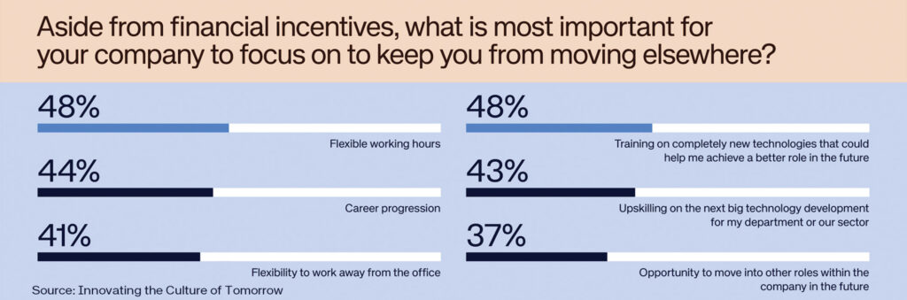 As a result, a premium has been placed on skills, rather than titles, and employees are increasingly seeking training and upskilling opportunities to stay ahead of the curve. Indeed, nearly half (48 per cent) of respondents cited access to training as a key factor keeping them at their current companies.