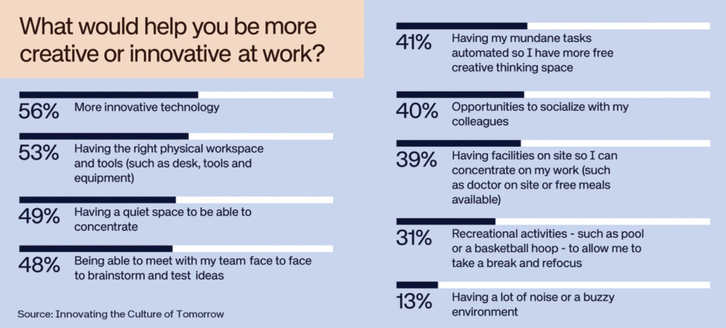 However, what I found most interesting is that having access to facilities to meet with the team face to face to brainstorm and test ideas (48 per cent) is just behind.