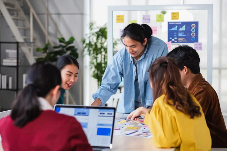 Asian ux developer agency and ui designer brainstorming about mobile app interface wireframe design on meeting table with at modern office.