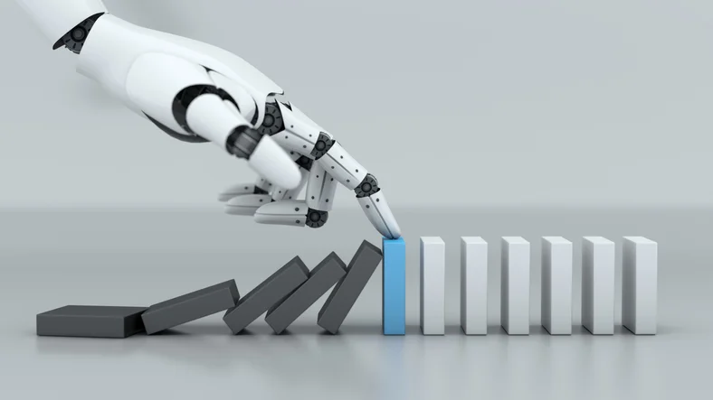 Robot hand stop crisis domino effect business, A.I. and machine technology, for AI app stack