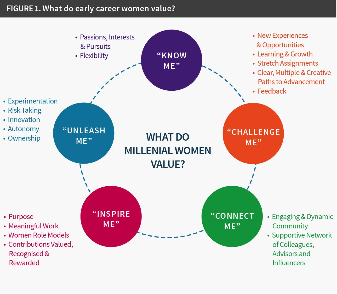 What do early career women want from their employers? What factors would make them stay? Our global study5 identified five themes, which represent what aspiring women leaders want from their companies: “Know Me,” “Challenge Me,” “Connect Me,” “Inspire Me,” and “Unleash Me.” (see figure 1 below)[ms-protect-content id=”9932″]