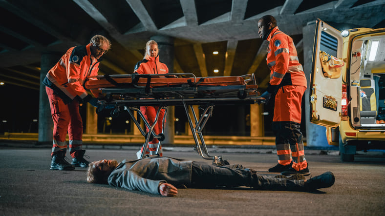 Two paramedics in reflective vests attending to a person lying on the road beside an open ambulance at night.